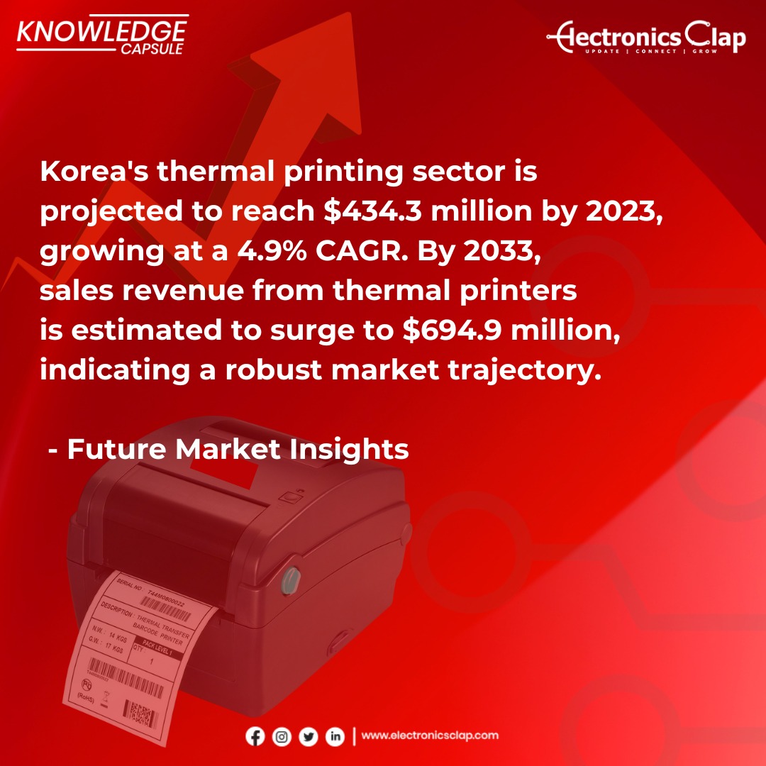 Korea’s thermal printing sector is projected to reach $434.3 million by 2023, growing at a 4.9% CAGR. By 2033, sales revenue from thermal printers is estimated to surge to $694.9 million, indicating a robust market trajectory. – Future Market Insights