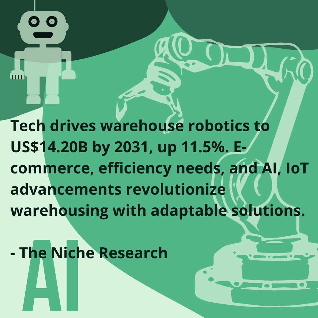 Tech drives warehouse robotics to US$14.20B by 2031, up 11.5%. E-commerce, efficiency needs, and AI, IoT advancements revolutionize warehousing with adaptable solutions. – The Niche Research