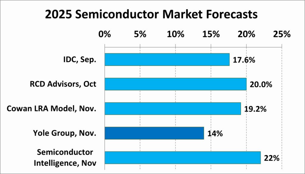 Recent forecasts for the 2025 semiconductor market growth range from 14% from Yole Group to 22% from us at Semiconductor Intelligence.