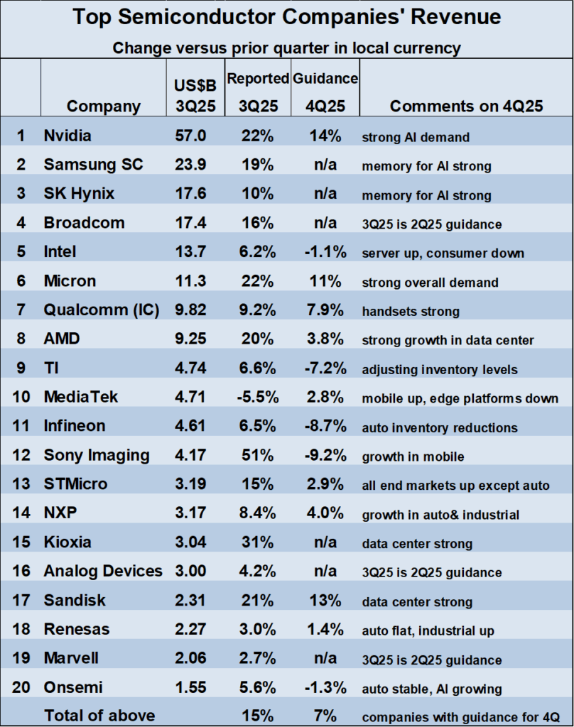 Semiconductor company guidance for 4Q 2025 revenue change is mixed. Of the fourteen companies providing guidance, nine expect increasing revenue ranging from 14% at Nvidia to 1.4% at Renesas Electronics. Five companies guided revenue declines, ranging from -1.3% at Onsemi to -9.2% at Sony Imaging.
